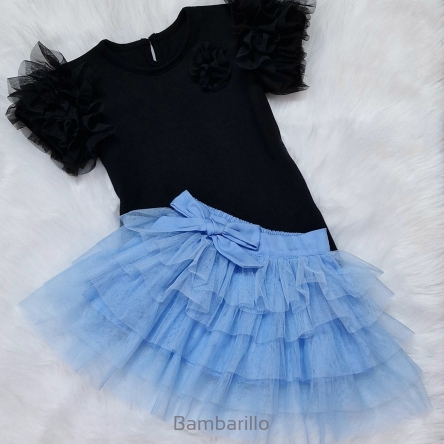 Spódniczka wykonana jest z bawełno-satyny (podszewka, pas, kokarda) i tiulowych falban. Z tyłu w pasku, dla wygody zakładania ma wszytą gumę.